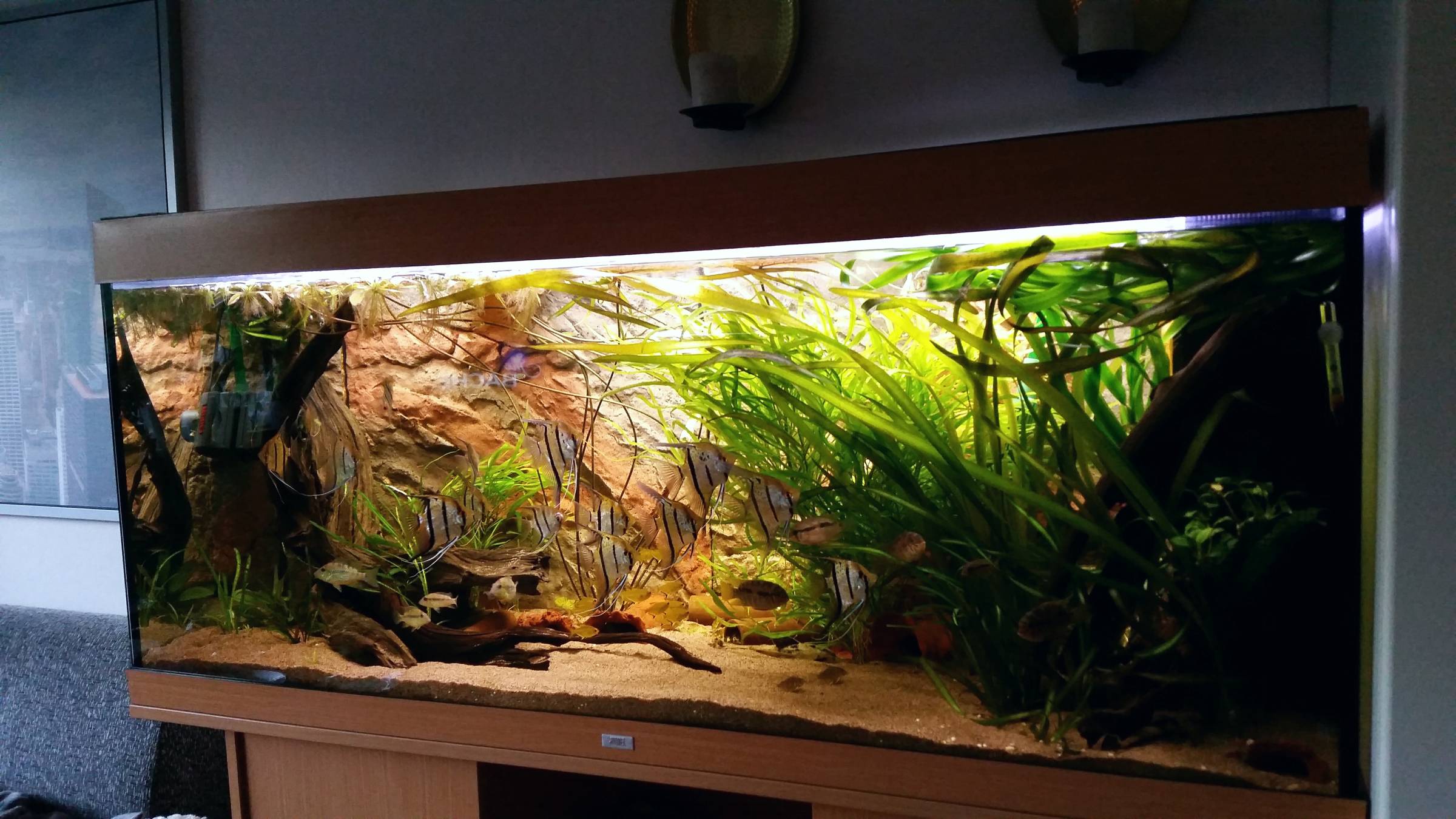 450l med 6300l/h och generellt är det P. scalare rio nanay F1 + VF, P. leopoldi VF, krobia xinguensis, Geophagus Steindachneri och många roliga malar, behöver rensa en hel del växter men blev en bild nu.